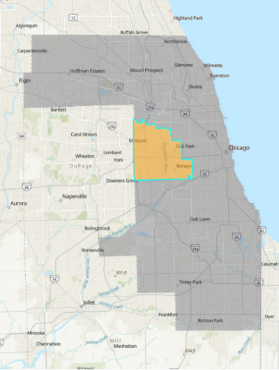 The Circuit Court of Cook County's Fourth Municipal District is made up of the following municipalities and townships in the western suburbs of Cook County: the municipalities of Bellwood, Berkeley, Berwyn, Broadview, Brookfield, Cicero, Elmwood Park, Forest Park, Franklin Park, Hillside, La Grange Park, Maywood, Melrose Park, Northlake, North Riverside, Oak Park, River Forest, River Grove, Riverside, Stone Park and Westchester; and the townships of Berwyn, Cicero, Leyden, excluding that part lying within the territorial limits of the municipalities of Rosemont and Schiller Park, Oak Park, Proviso, River Forest, and Riverside.